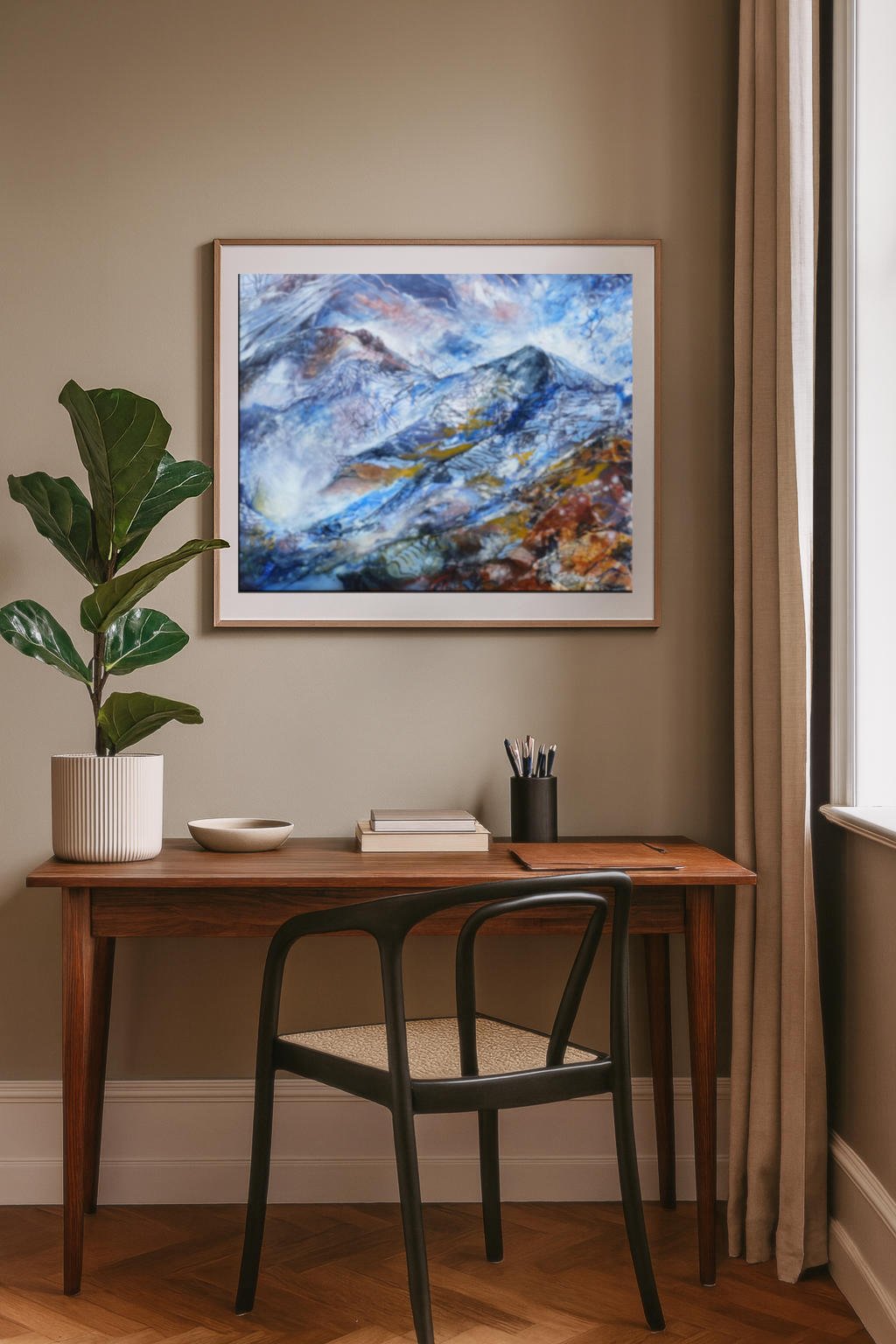 A limited edition (95), signed and numbered giclee print of the painting “Across the Ages, Skye” by Scottish landscape artist Julie Arbuckle.